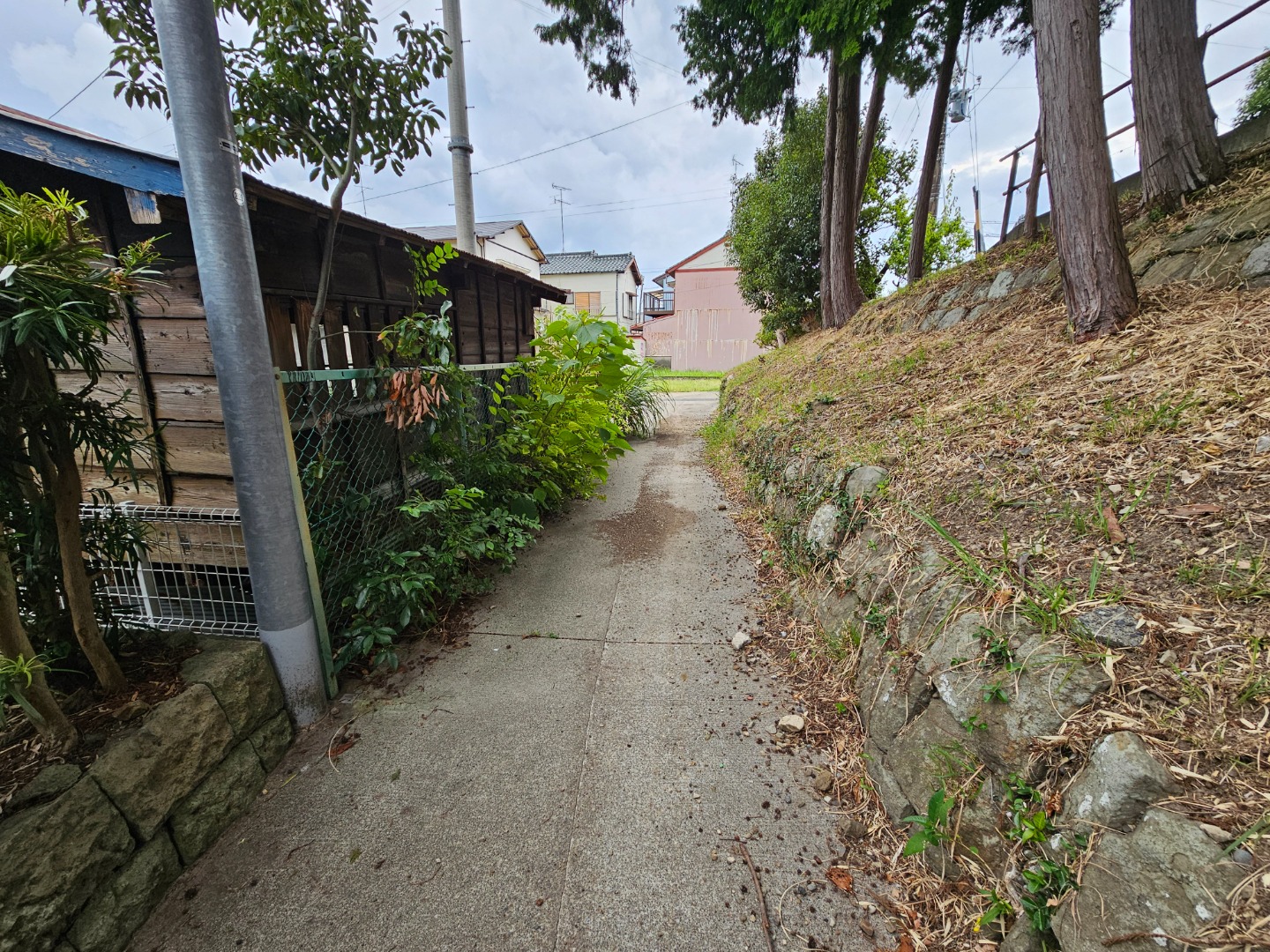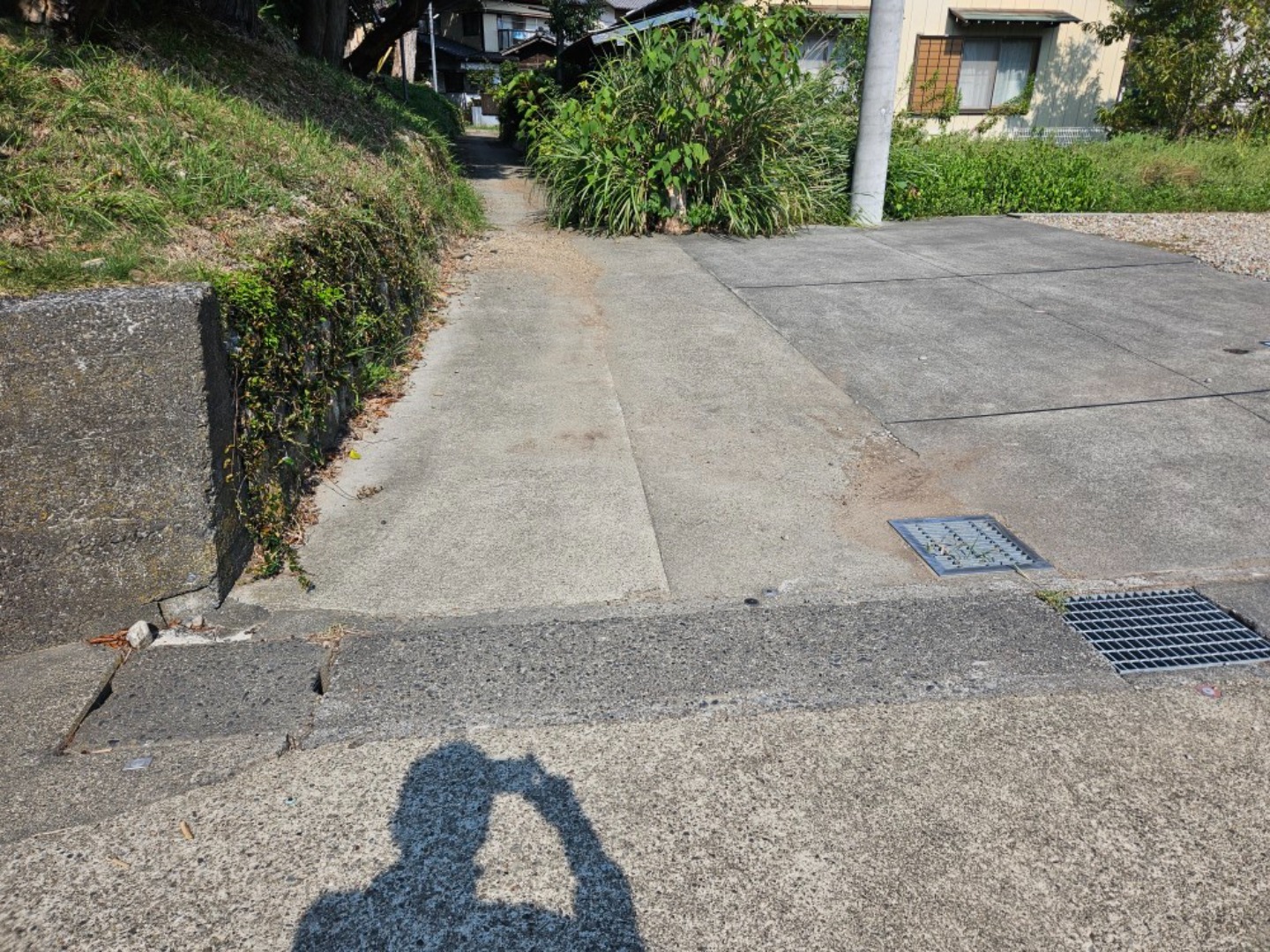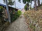 向かいのお寺斜面がガケ条例抵触可能性あります。また排水側溝整備が別途必要となります。