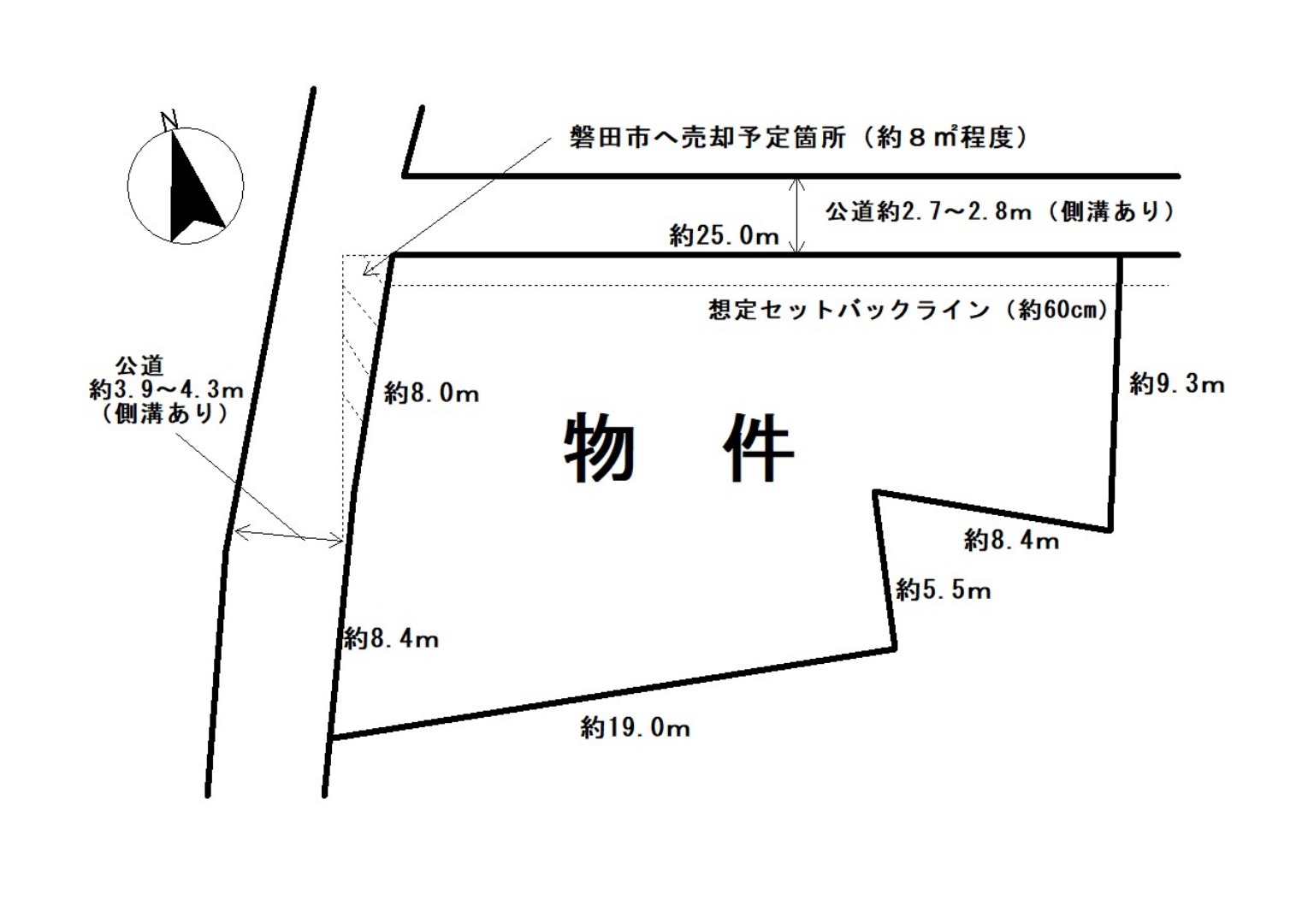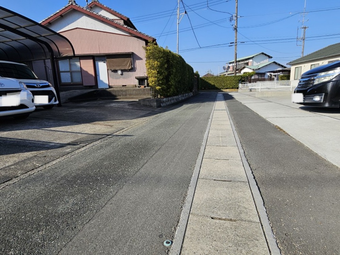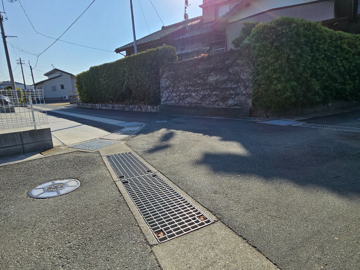 | 備考 | 角一部を磐田市へ売却・寄付予定になります。北側道路は特にセットバック約60cmを要しますので、その範囲内は工作物設置も不可になります。小学校まで約790m、中学校まで約1570m、スーパーまで約920m、ドラッグストアまで約360mになります。 |